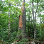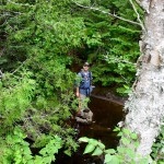 Our hike to Alvin Lake Peak was made difficult by the thick bush that slowed our passage through the woods. As we neared a lake we arrived at the edge of a small but steep canyon. A small creek flowing from the lake ran along the bottom. We were able to cross it via a beaver dam built up along the shore of the picturesque lake. Past the lake we headed north into mixed forest, with everything from towering white pines to gnarled maple trees and thick tag alder. Several interesting rock outcrops with large quartz veins caught our interest and we investigated them for gold without success.