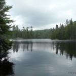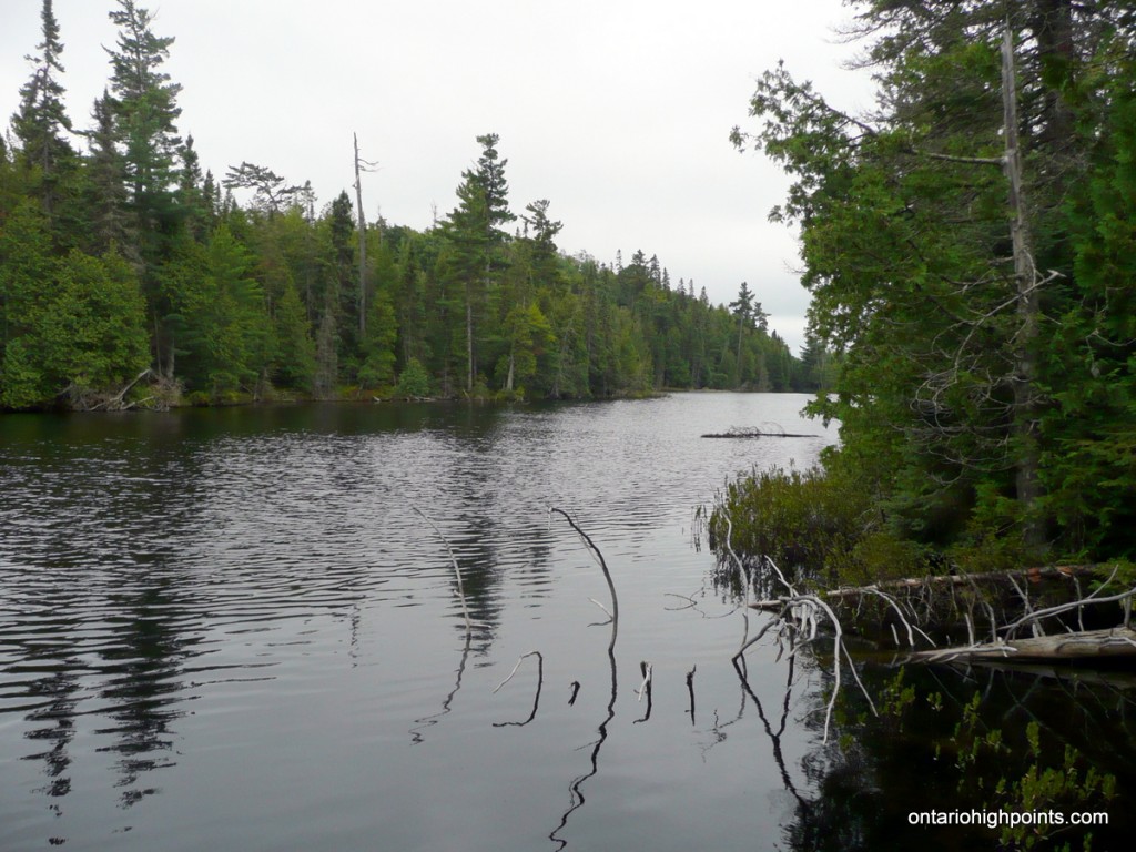 Before the slopes of Alvin Lake Peak can be ascended, navigate a large marshland and creek which runs roughly parallel to Mile 67 Road. The easiest way to cross it is to head west from the road and walk along the top of a beaver dam located at N47 13.448 W84 17.026. Beyond the beaver dam, head northwest, gaining elevation and head towards an unnamed lake. A creek which flows southwest from the lake along an uncharacteristically steep chasm can be crossed via a beaver dam situated along the lake shore.