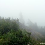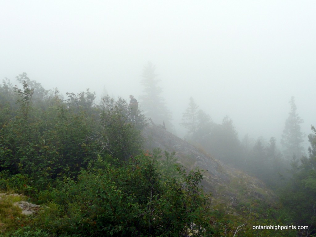 Nearing the summit, our maps showed a small pond which we skirted to the west to avoid. Beyond the pond we reached the summit cliffs which loomed before us. They were too steep to climb, so we changed course and headed east towards more gently ascending slopes which we were able to climb up onto the partially open summit of Alvin Lake Peak. Our maps indicated the highest point was to our northwest so we hiked along the rocky outcrops atop the cliff edge. Unfortunately the summit was in the clouds and our views down into the valley were obscured by fog.