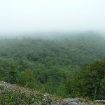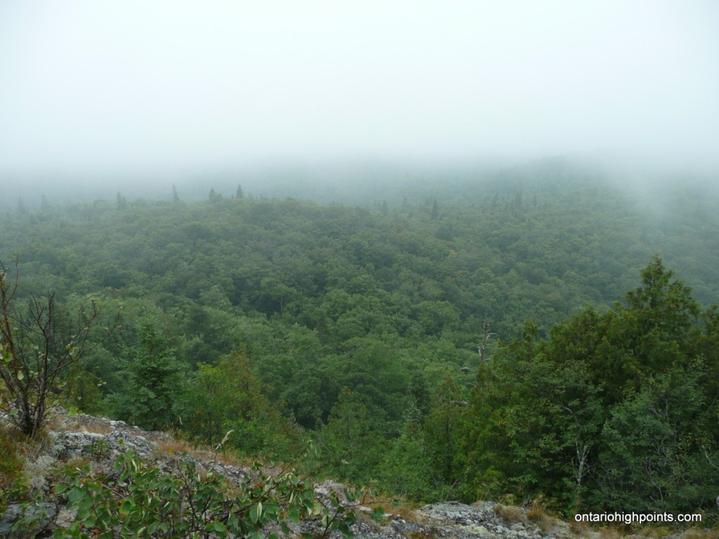 Once gaining the top of the last steep pitch, proceed northwest across the mostly open summit area though grass and exposed rock outcrops to the highest point on the mountain at N47 14.728 W84 16.387. On clear days, there should be good views west to Peak 637 atop the western cliffs.