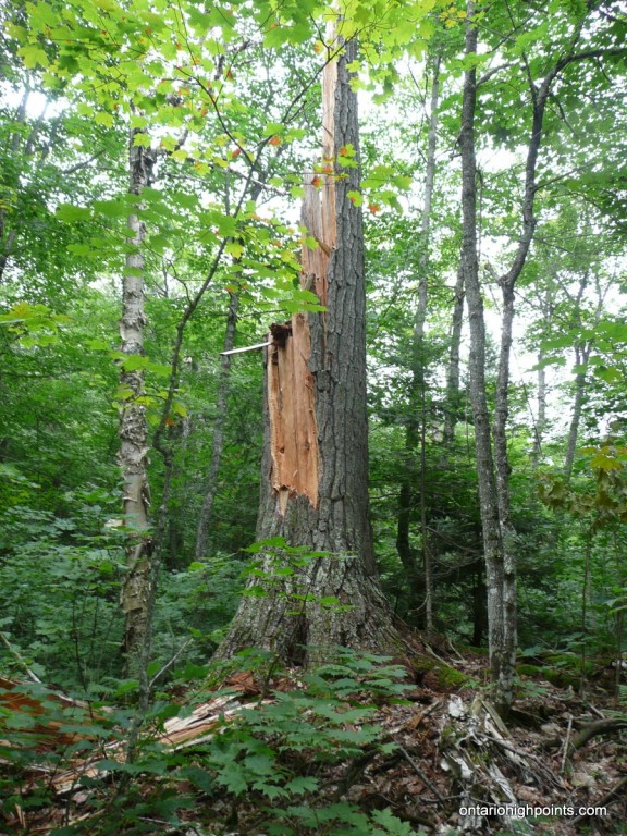 Follow the west edge of the lake until reaching the northern shore and then head north for 1.5 km though forest. Large white pines which survived logging dot the area. Just south of the Alvin Lake Peak summit area, a small pond must be circumvented. It is more direct to round the lake on the eastern edge to reach the more moderate south slopes up to the summit as the western side of Alvin Lake Peak is dominated by steep rock cliffs.