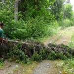 Beyond the railway tracks the road narrowed and we encountered a few washouts — some of them required some minor road maintenance. At one section of the road some trees had fallen across the road. Luckily Dan had prepared for this and brought his chainsaw. We each took our turns sawing up the trees and in no time we had the road cleared and we continued on. As the road changed it’s course from north to east, we got a good view of some high hills through the trees which I determined to be part of the Alvin Lake Peak Ridge: Peaks 637 & 634.