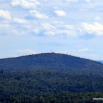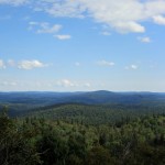 The remaining ascent was easily navigated as the mixed forest did not provide any major obstacles or bushwhacking challenges. The upper elevations were dotted with abundant concentrations of blueberries and a rocky ledge which presented good views of the region to the south; Austin Lake Peak and the fire tower on it’s summit visible in the distance.