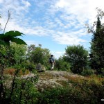 Beyond the ledge and after traversing through rocky clearings and the sparse forest for about 200 meters, we determined that we had found the highest point on the peak on a flat exposed rock outcrop at N47 41.543 W84 01.056.