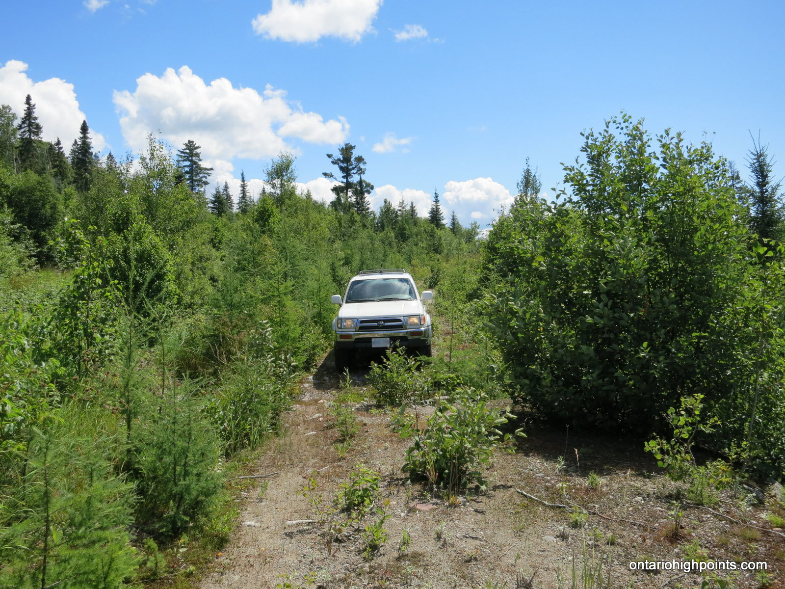 Travel along Beaupartlant Road, which is narrower and rougher, for 21.3 km. After crossing Jimmy Creek, turn right (or park) onto an overgrown road which diverges to the right. Only 4×4 vehicles should proceed beyond this point. Travel 2.7 km to the end of the road, where there is a small open area suitable for parking at N47 36.140 W84 18.704.