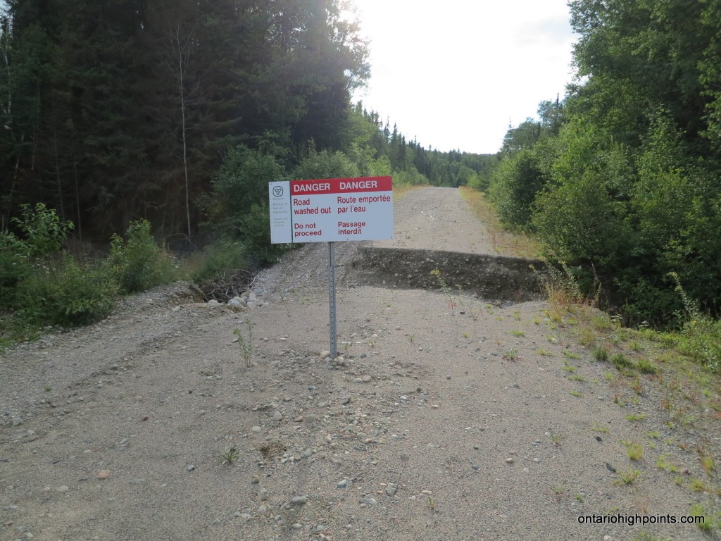 Unfortunately, half a kilometer along Millwood Road, we encountered a severe washout which blocked our route. Miles from our objective, we abandoned our Parch Creek Peak plans for the next day and headed out, back to Wawa for supper. It was late night when we finally rolled into the Soo region.