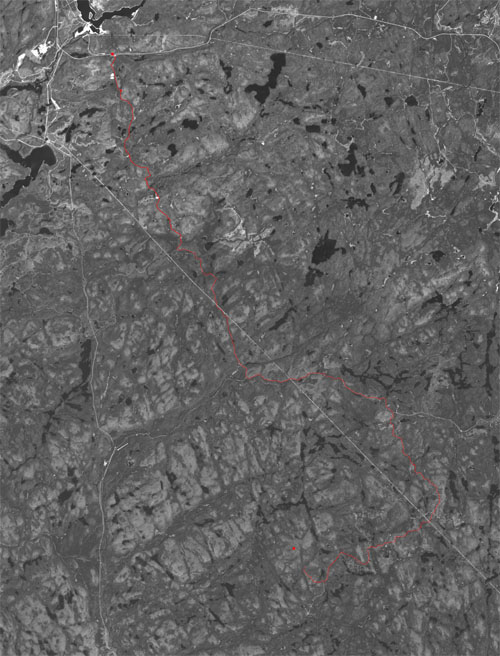 Satellite Image (small) with Route in Red (Courtesy of geobase.ca)