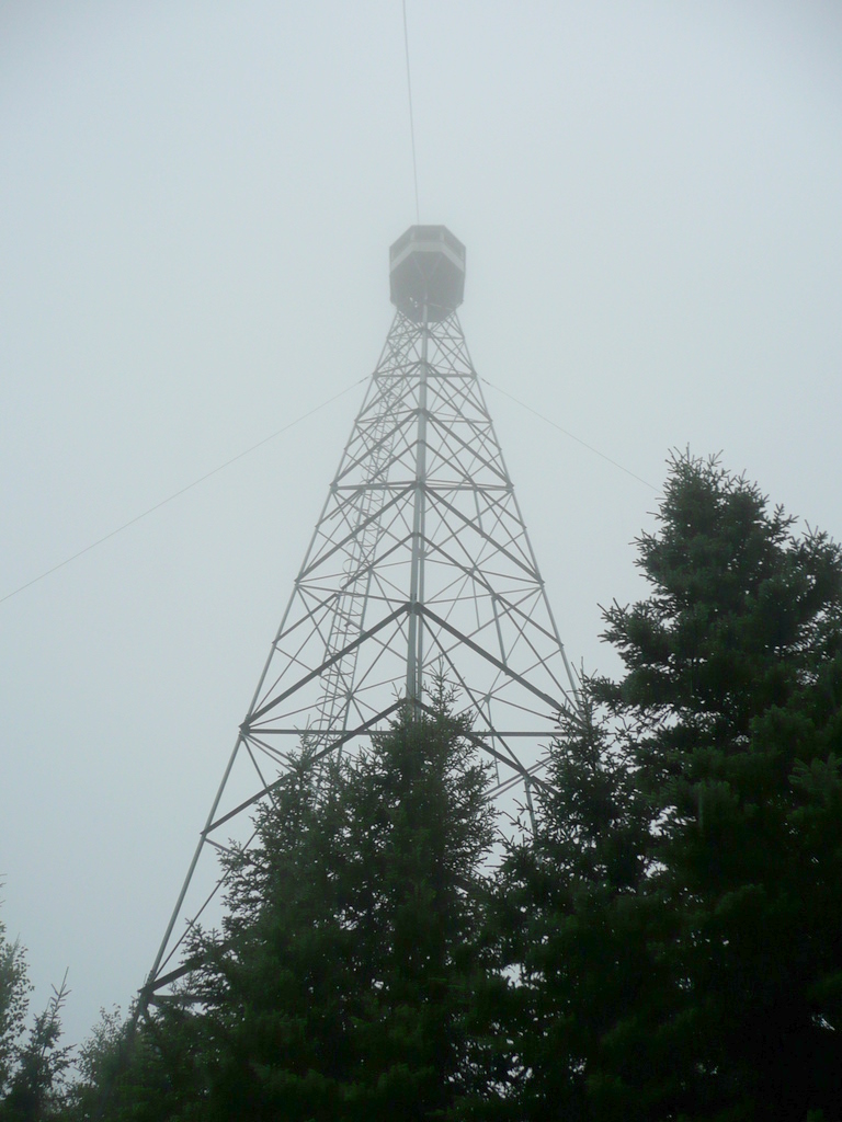 Returning to the treed summit, I didn’t bother to climb the ladder, as the fog didn’t allow much of a view and the rain would make it an uncomfortable experience. On a clear day there would be good views from the ladder, above the treeline.