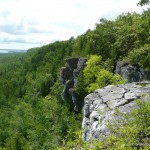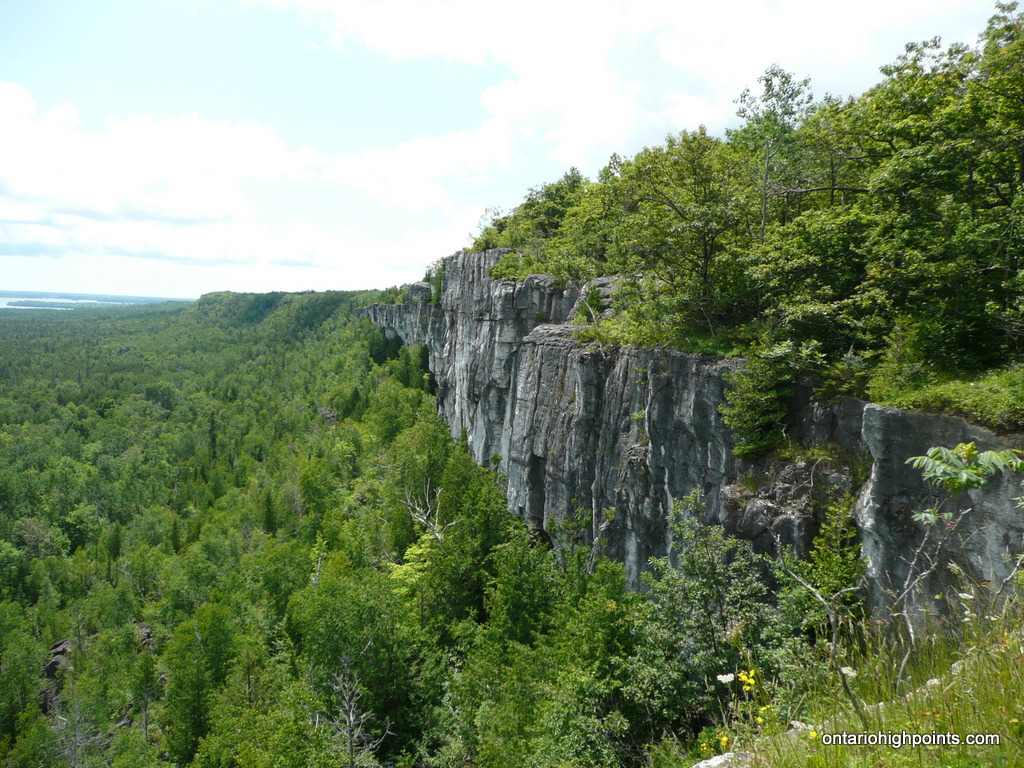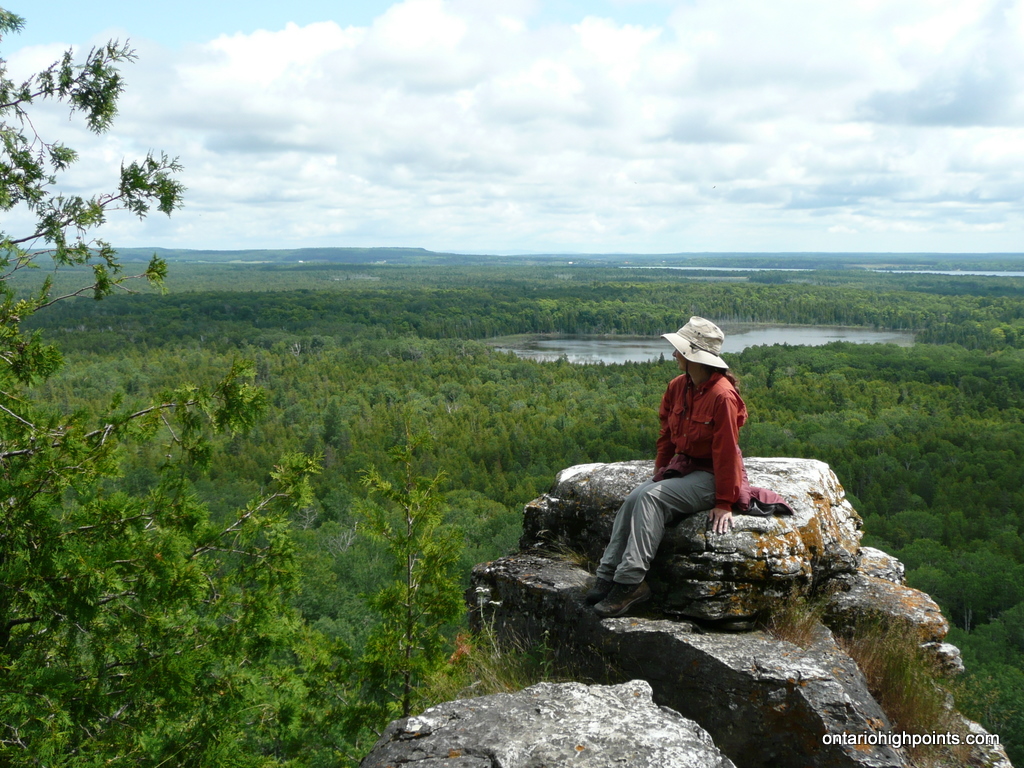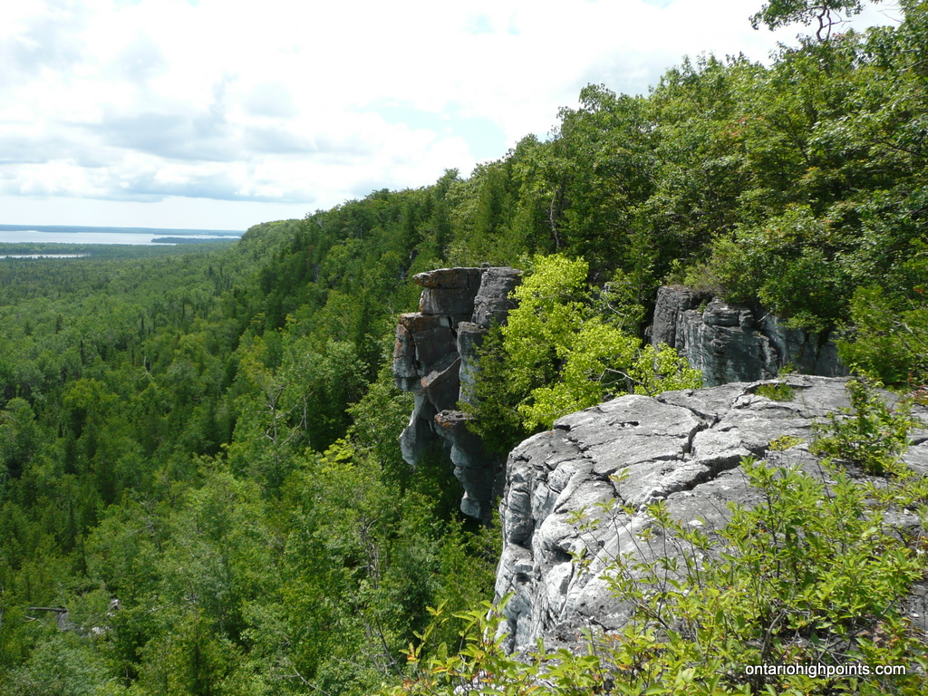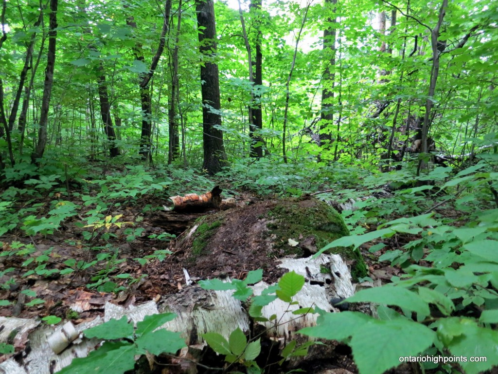 There are 2 main trails as well as a couple of side ‘adventure’ trails for the Cup and Saucer. The white and blue trails form a 9.9 km loop around the Cup and Saucer formation. The most direct route from the parking lot to the Manitoulin High Point is to take the more scenic white trail up the Cup and Saucer. Shortly past the steep climb up to the East Lookout, a side trail branches to the right and it is a short walk to a small concrete footing which is the highest point along the trail. The highest point on Manitoulin however, is 50 meters southwest off the trail at the coordinates: N45 51.000 W82 06.370. A large tree beside a pile of fallen trees / branches is the most likely location of the highest point. A moss covered boulder 20 feet northeast of the tree is another candidate for highest point.