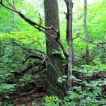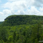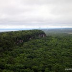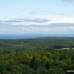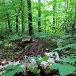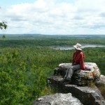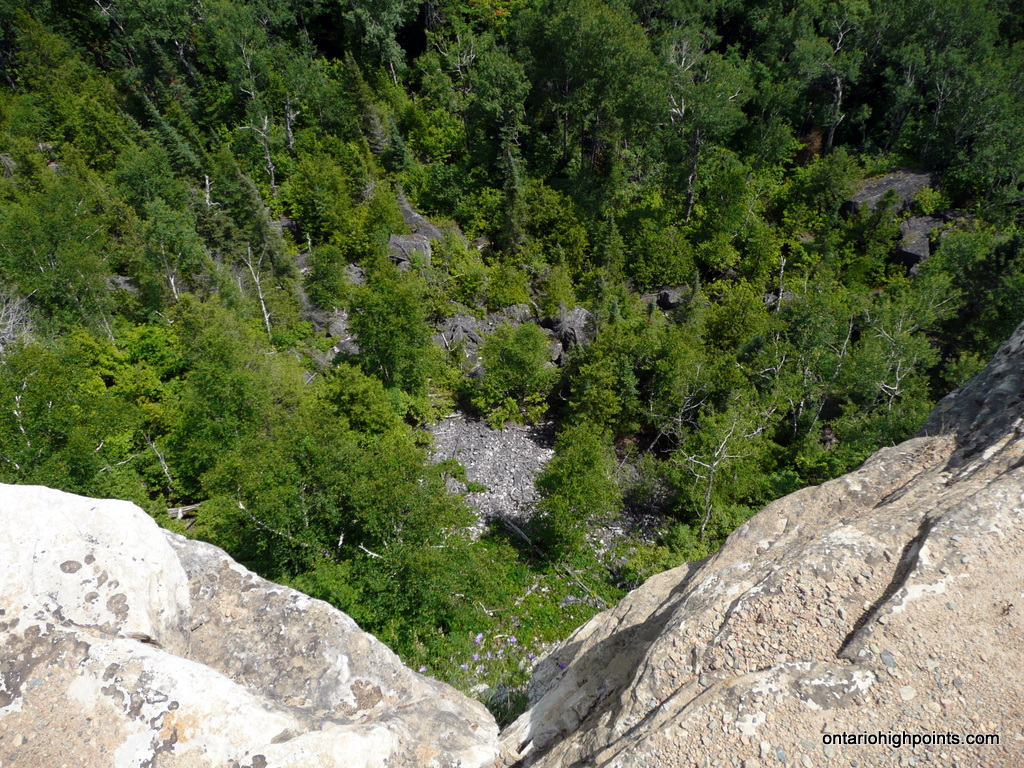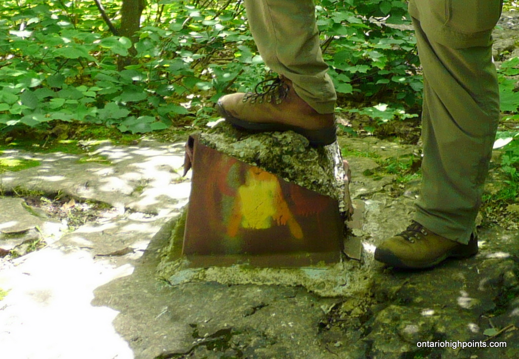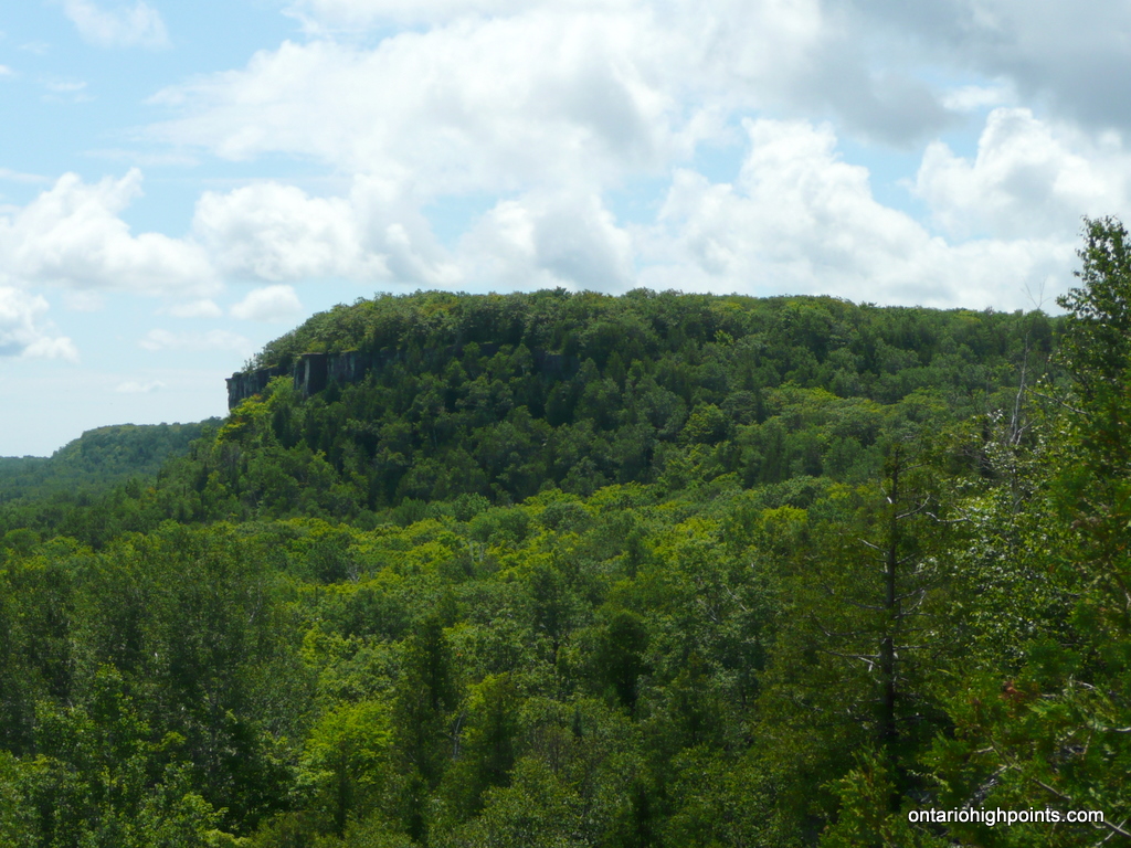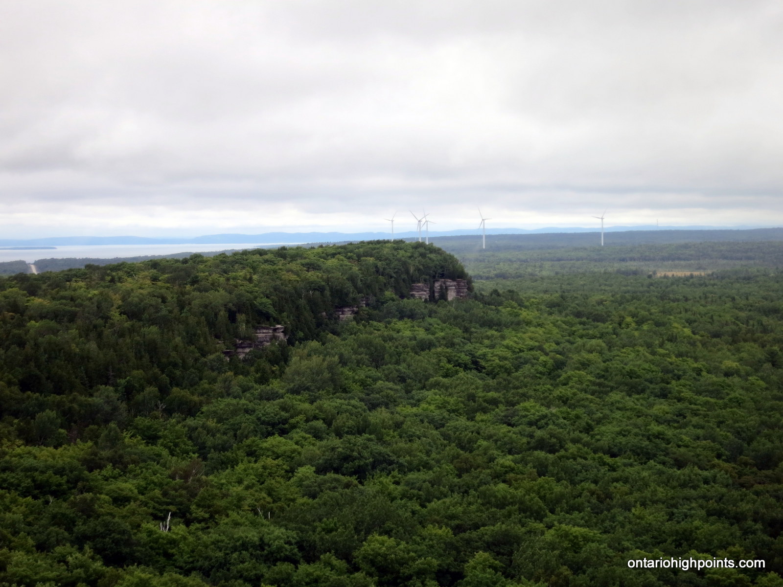 There are 2 main trails as well as a couple of side ‘adventure’ trails for the Cup and Saucer. The white and blue trails form a 9.9 km loop around the Cup and Saucer formation. The most direct route from the parking lot to the Manitoulin High Point is to take the more scenic white trail up the Cup and Saucer. Shortly past the steep climb up to the East Lookout, a side trail branches to the right and it is a short walk to a small concrete footing which is the highest point along the trail. The highest point on Manitoulin however, is 50 meters southwest off the trail at the coordinates: N45 51.000 W82 06.370. A large tree beside a pile of fallen trees / branches is the most likely location of the highest point. A moss covered boulder 20 feet northeast of the tree is another candidate for highest point.
