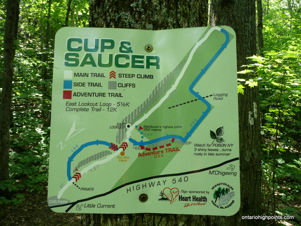 The Cup and Saucer is the highest point on Manitoulin Island. There are 2 ways to get to Manitoulin Island. From Sudbury, take Highway 17 west and turn south onto Highway 6 through Espanola. Continue on Highway 6 for 52 km and cross the swing bridge into Little Current. Continue west on Meredith Street, past the intersection with Manitowaning Street (keep straight), where Highway 6 diverges left and then turn left on Worthington Street where Highway 540 begins. Continue on 540 for 23 km and turn left onto Bidwell Road. The parking lot for the Cup and Saucer trail is a short distance (600 meters) on the right.