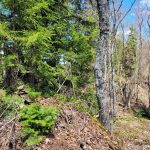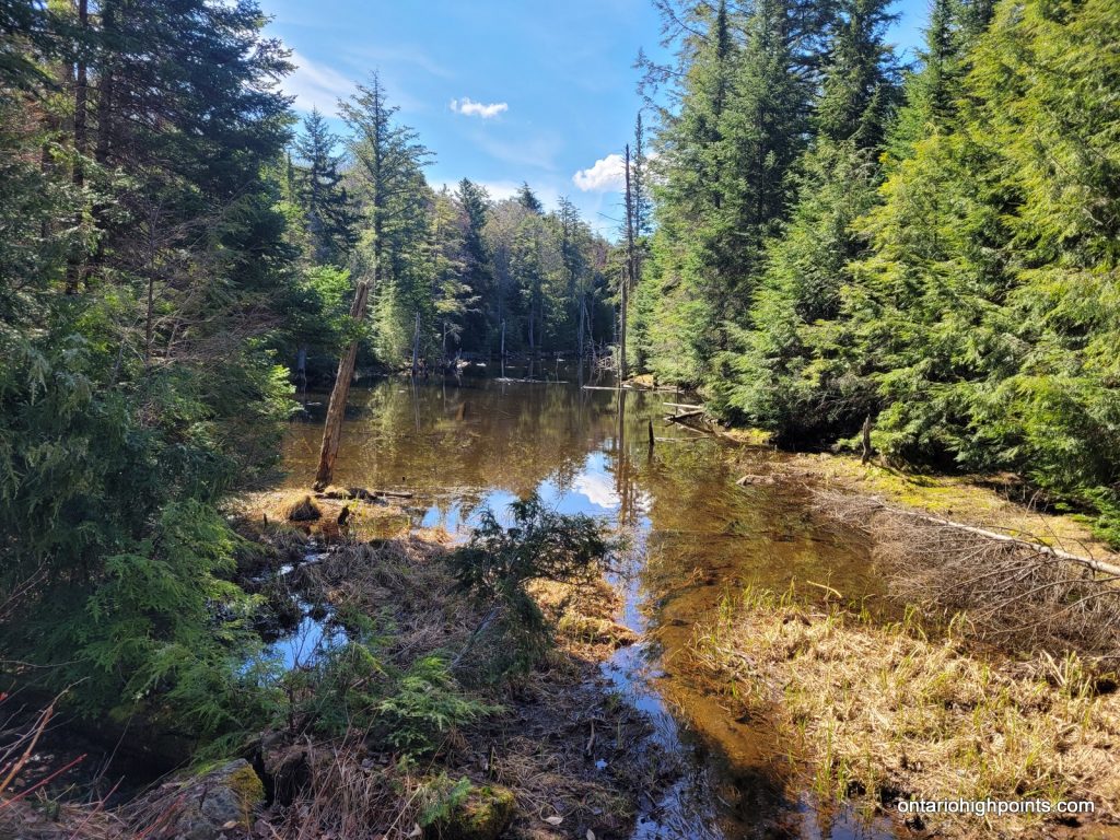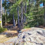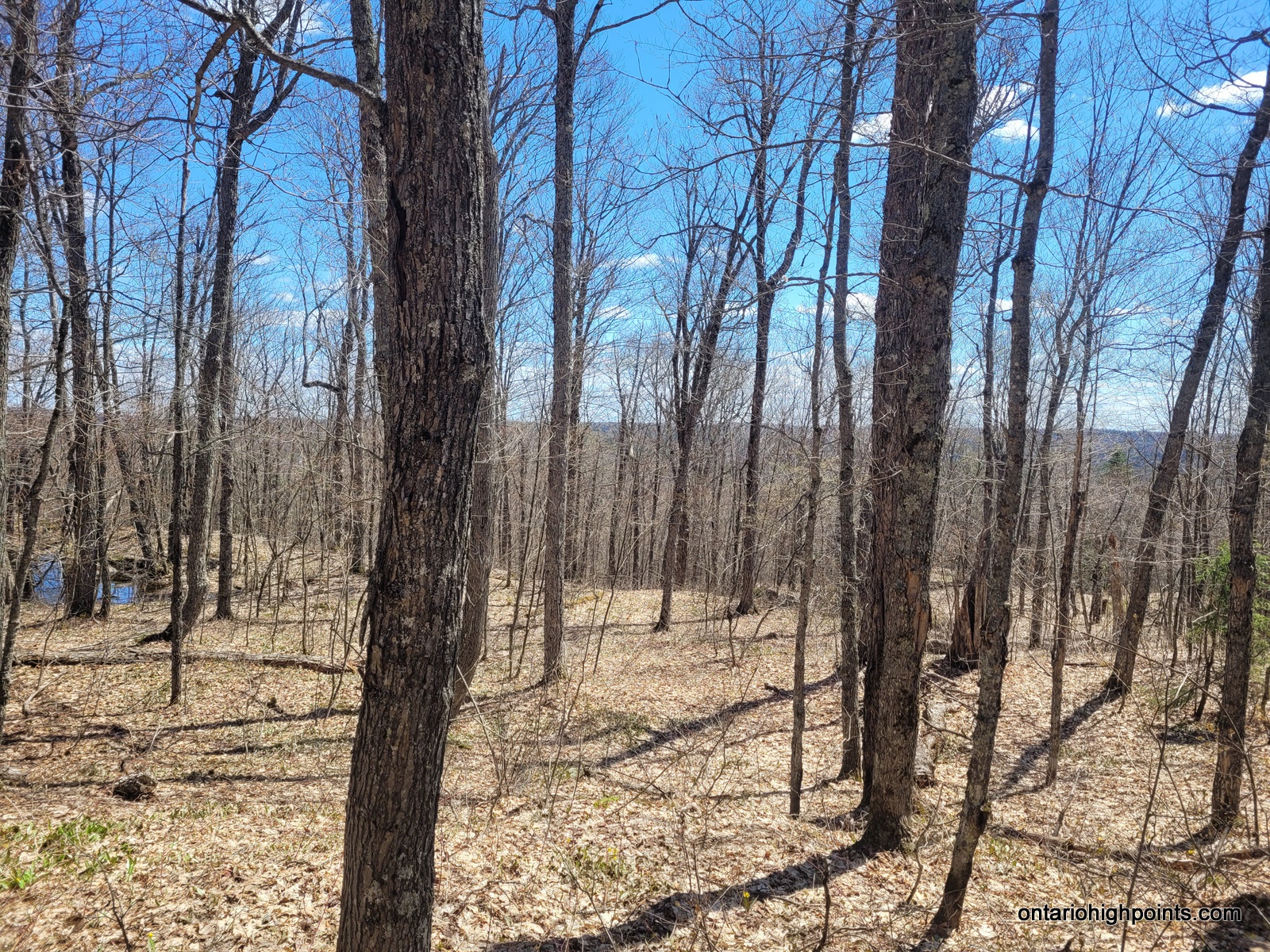 The bushwhack is primarily through open old growth deciduous forest, although there’s a couple marshy areas which might be flooded in the spring. After about 700 meters of bushwhacking you will cross a portage which heads south to a nice campsite on Rockaway Lake (the portage leads to Minkey Lake to the north). Round the northern edge of Rockaway Lake, head ESE and ascend the highlands. A direct approach up the final ridge to the high point is quite steep so it’s easier to ascent the ridge further north. Once on the ridge, turn south and head towards the summit.