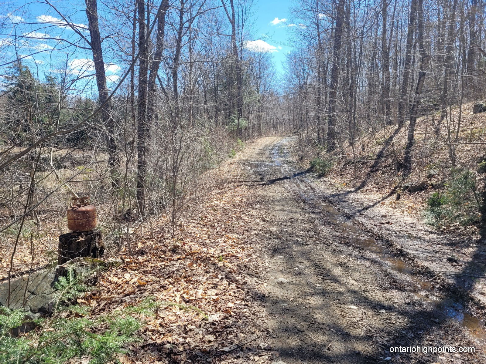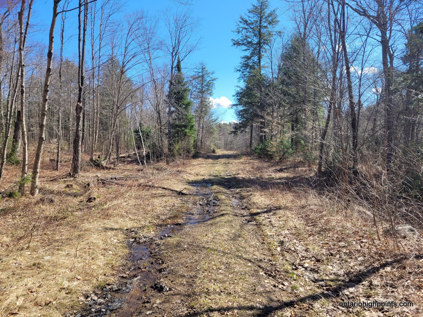 For the next 4.1 km you will follow a series of logging/ATV paths. Turn left at 400 meters, another left at 1.2 km, a right at 1.6 km, another left at 2.6 km, and then another right onto an overgrown trail at 3.3 km. The overgrown trail passes near Butter Lake and eventually ends/becomes unrecognizable after 800 meters from the turn off (about 4.1 km from Dagger Lake Access Road). The remaining distance (2.8 km) to Dividing Lake Provincial Park High Point must be bushwhacked.