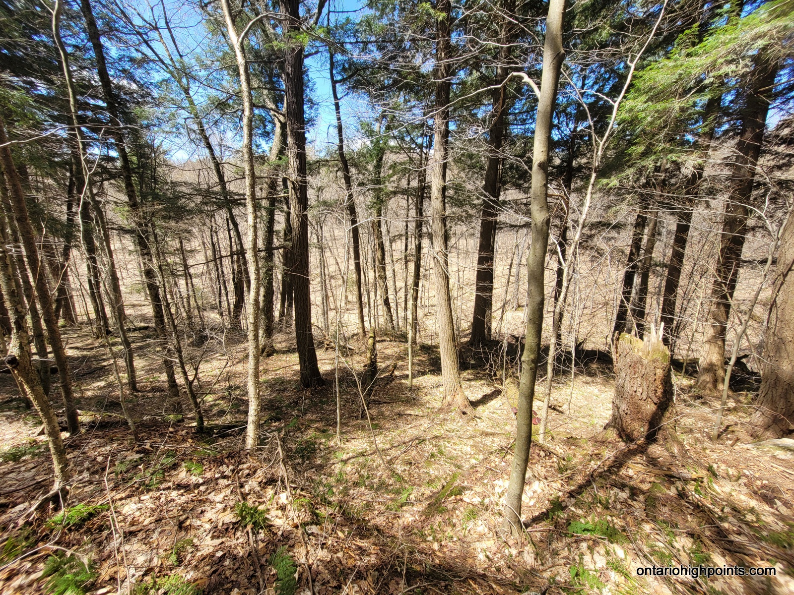Dividing Lake Provincial Park High Point is a non-operating/nature reserve class park and was established to protect spectacular old growth pine and hardwood forests. This remote park is situated between the southwestern border of Algonquin Park / Dividing Lake and Rockaway/Dagger Lakes to the west. This area can be accessed via the Dagger Lake Access Road (which can be accessed from Livingstone Lake Road) or via the Wildcat Canoe Route, which links this Nature Reserve to Algonquin Park. The park’s high point is at its southeast side, 500 meters west of the Algonquin boundary line.
