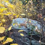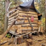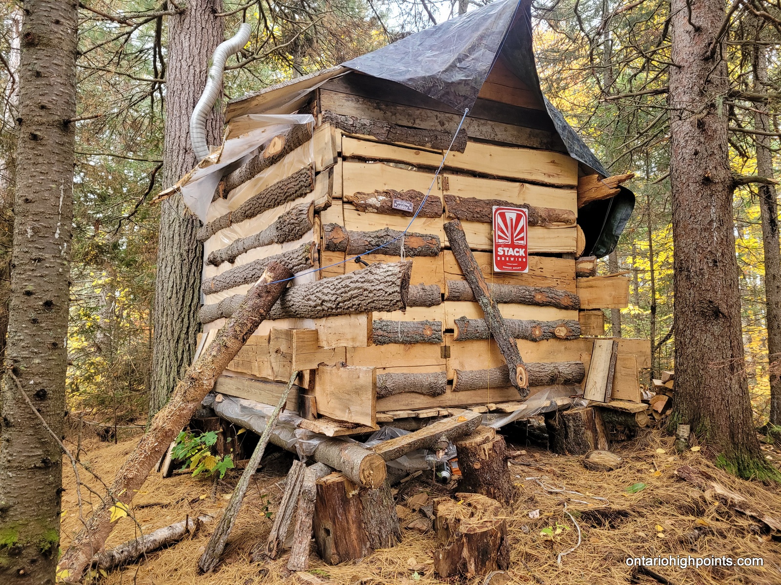 There’s a series of very overgrown skidder paths in the area. On my ascent I followed one that paralleled the road south for 400 meters, then I followed a branch southwest and began the steep ascent. After about 200 meters the overgrown skidder path ended and I had a steep bushwhack up the remaining 450 meters to the summit. Once on top of the ridge, I discovered a small hut with a wood stove and and found the highest point atop a large boulder about 50 meters south of the hut. There are also limited views just south of the hut and high point boulder.
