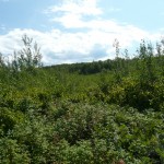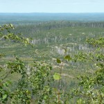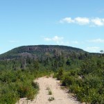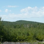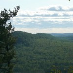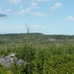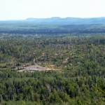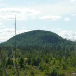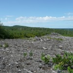 Much of the area had been clear cut logged only a few years ago, opening up great views of the surrounding terrain. The view to Tower Mt. was particularly impressive — the dramatic cliffs of the western face of the 2nd largest mountain in Ontario were clearly visible. Just over a kilometer from my bike, I reached the end of the road which had a large amount of lumber debris (shredded timber and bark, rotting stumps, etc).