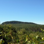 Depart the overgrown road and bushwhack southwest 215 degrees true north (magnetic declination 220 degrees) through forest for 950 meters until reaching the summit.