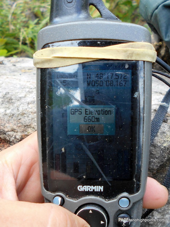 Turn right and proceed south at the T-Junction, take a left turn at the fork at kilometer 9.3 and then turn right (west) at kilometer 9.9. You’ll arrive at nearest point to Head Lake South Peak (N48 17.981 W90 07.738) at kilometer 10.9 — the start of the bushwhack.