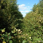 We stashed the bikes in the woods and continued on foot. Even though the road was completely overgrown in many spots, the road surface was level and in good shape with few ruts or boulders.