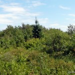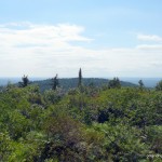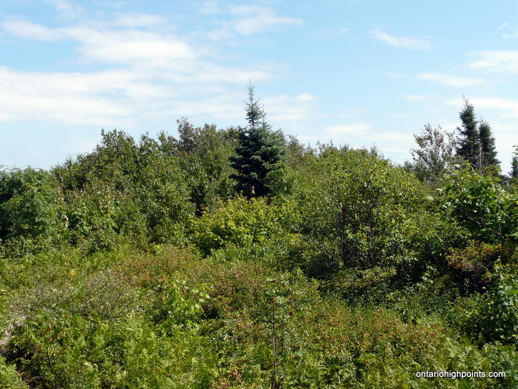 Crossing an overgrown beaver dam at the east edge of Dick Lake, the remaining 1.1 km of trail ascends almost 500 feet to the summit. Closer to the top, the firetower at the summit will come into view. A large boulder hidden by thick bushes at N47.31670 W80.74884, 50 meters from the base of the tower may be the highest point on the summit. At the base of the tower, there are good views towards the North and South peaks.