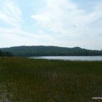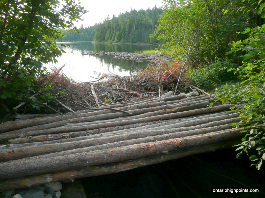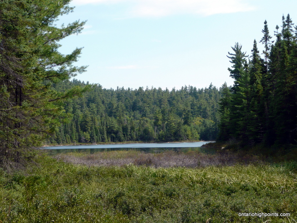 The 3.7 km trail to the Ishpatina Ridge – Tower Peak begins at the canoe launch on Scarecrow Lake and ascends through an area regenerating from a recent bush fire — wild raspberries and blueberries are abundant here. The trail skirts a small lake and begins a moderate ascent northwards. About 1.7 km from Scarecrow Lake, the trail passes through a lowland marsh near a second lake along the trail. Logs and wood planks have been layed along the trail to make the passage across easier. Once traversing the marsh, the trail begins to climb more steeply for 0.7 km.