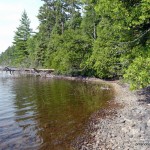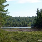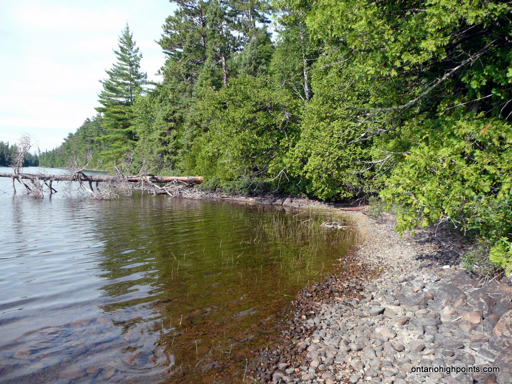 If water levels are low on Scarecrow Lake, it may be possible to save time and energy by walking along the rocky shoreline. Occasionally, one will have to swing back into the bush to avoid blow-down and/or marshy areas. There is also a a fairly well established animal path along the lake edge. Once reaching the northwest shore of Scarecrow lake, the bushwhack ends at a well-established campsite and the start trail to the Ishpatina.