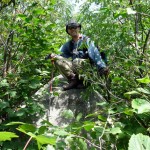 Continuing on foot, we hiked north for a short while, and then took a right turn onto another similar bush road. This road was still easy to follow as it headed east. Only 800 meters into the hike, we arrived at a fork in the road which confounded us for a minute. I was pretty sure we had to take the left fork, but just in case I hiked a bit along the right fork, which headed south — the wrong direction, into a marsh. Backtracking to the fork, we confidently took the left fork onto a narrow and overgrown trail.