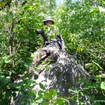 Just over a kilometer from the bridge, we reached the end of the 6.7 km section of road, and turned off onto a more overgrown bush road. We ditched the bikes as planned just off the trail in the dense bush — there wasn’t a soul around but we figured we’d hide them just in case.