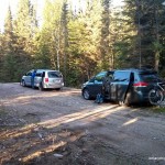 We left the summit and descended via the first candidate high point. On the return, we decided to take a chance and crossed the boggy area we had avoided on the ascent. It was covered by deep peat moss, but luckily not too wet. Back on Caldwell Road, we met up with Bryan, a gravel truck operator from Atikokan, who had noticed our tire tracks etched on the road from earlier in the day. He was surprised to see us, as hiking/biking isn’t a common activity for the area. We told him about the Kenora High Point and our peakbagging goals. He was familiar with the general area near our bushwhack as he had spent time fishing in Norway Lake. He told us about the lumber business and that they were expecting to extend Caldwell Road all the way north to Hwy 17 by next year (2017). After a friendly conversation, we continued north and arrived back at our vans, after a long 8.5 hour day.