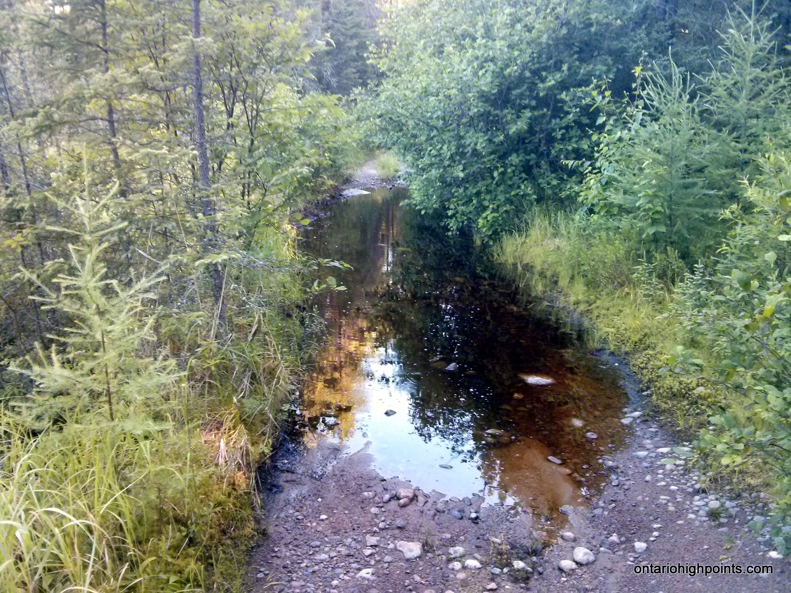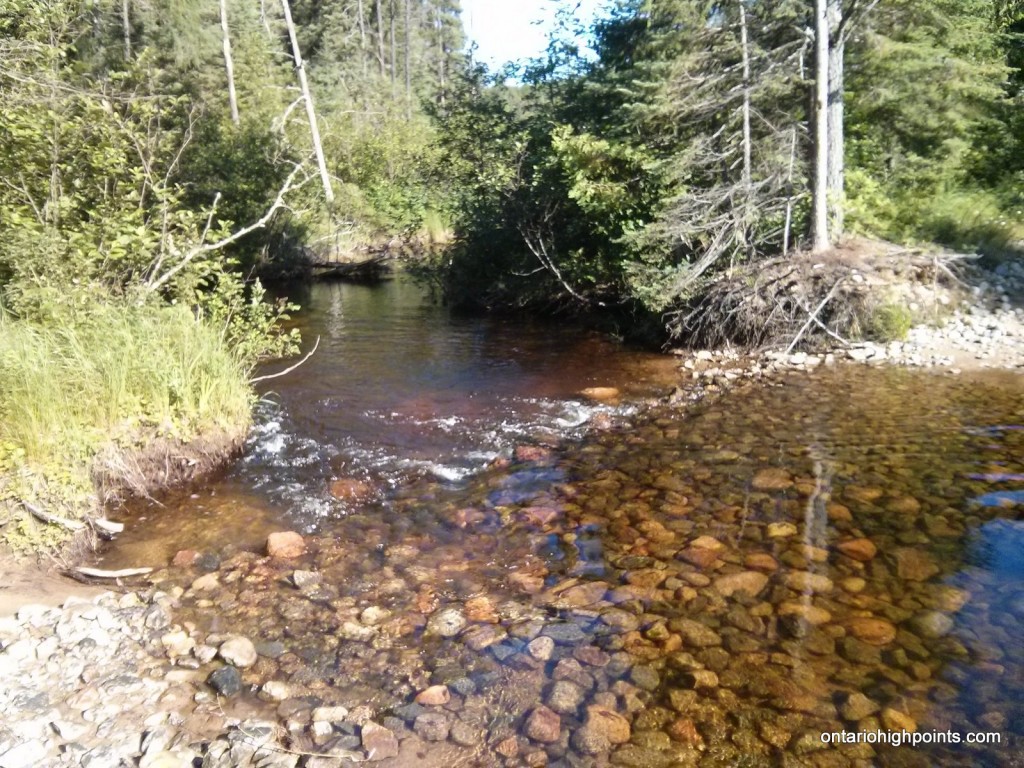 At 9.1 km from Hwy 17, the new road construction ends at a culvert. Park here. An overgrown 2-track bush road continues on, but is not navigable for most vehicles, so continue on bike or on foot from this point.