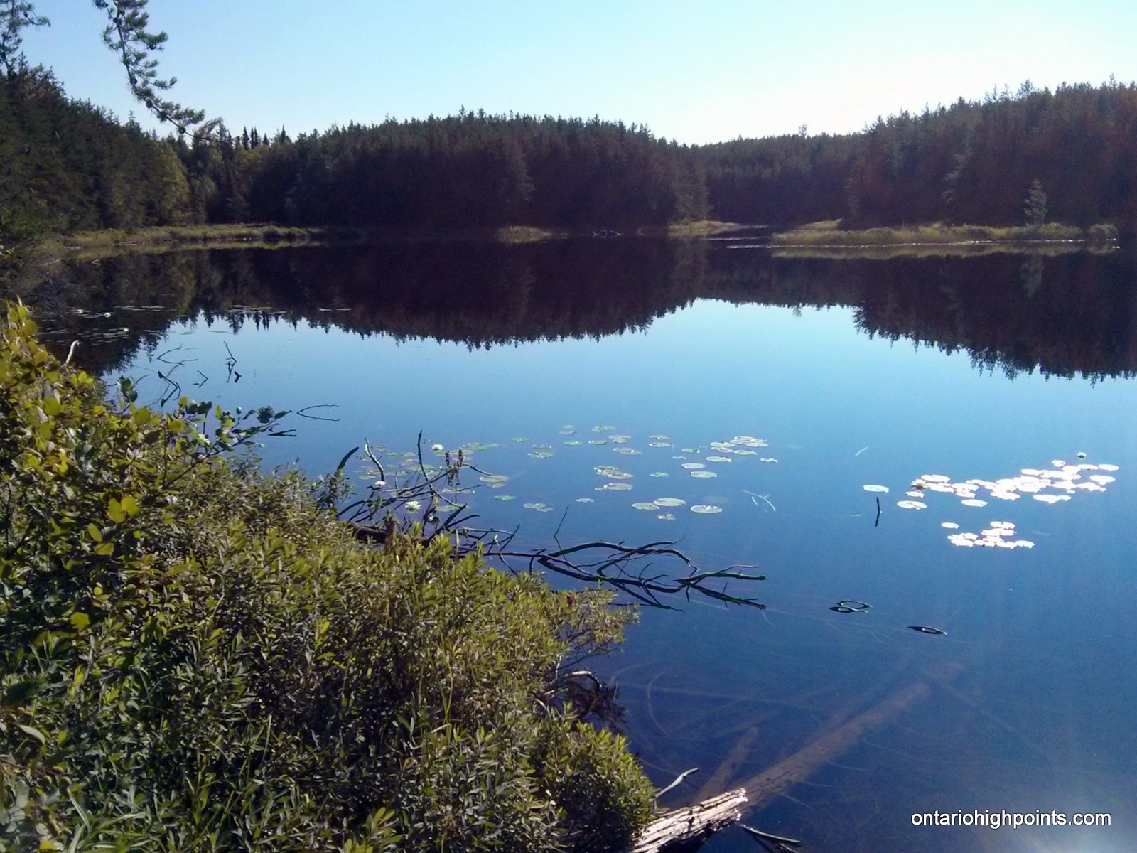 The title of Kenora District High Point is shared between 2 high point candidate areas who’s elevations lie within the margin of Ontario Base Map measurement accuracy. The High Points form part of the highlands located near the head waters of the Turtle and English Rivers about 27 km southwest of the small community of English River on Hwy 17. Fishing is the dominant recreational activity in the area and access to the lakes is provided by the numerous bush trails and logging roads (active logging operations active). There are no views at the High Points, but the route passes many photogenic lakes along the way.