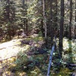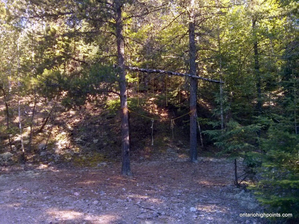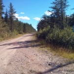 Stay left on the main 2-track road (1.2 km from the parking area) where a new road is being built. 7.3 km from the parking area, the 2-track bush road meets up with the newly constructed Caldwell Road, which could optionally be used to access the area from the south (It would be a 70 km drive north from Sapawe / Hwy 11 along active logging roads to reach the 2-track bush road turnoff to reach the High Point). 8.2 km from the parking area, turn right off of Caldwell Road back onto the overgrown 2-track bush road, cross the shallow Scotch River (no bridge) and continue for 3.1 km (11.3 km from the parking area) to an old gravel pit, which is used as a rustic hunt camp. The conditions of the road beyond get progressively rougher, so if biking, you may wish to stash your bikes at the camp.