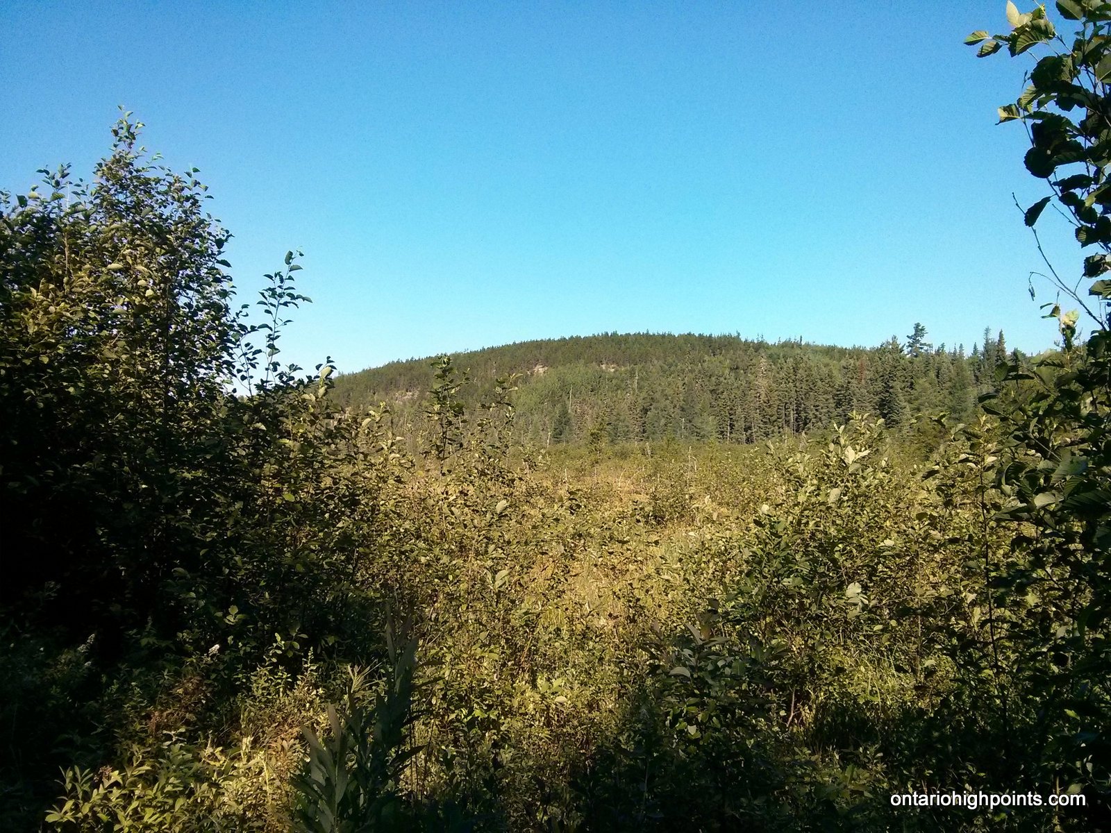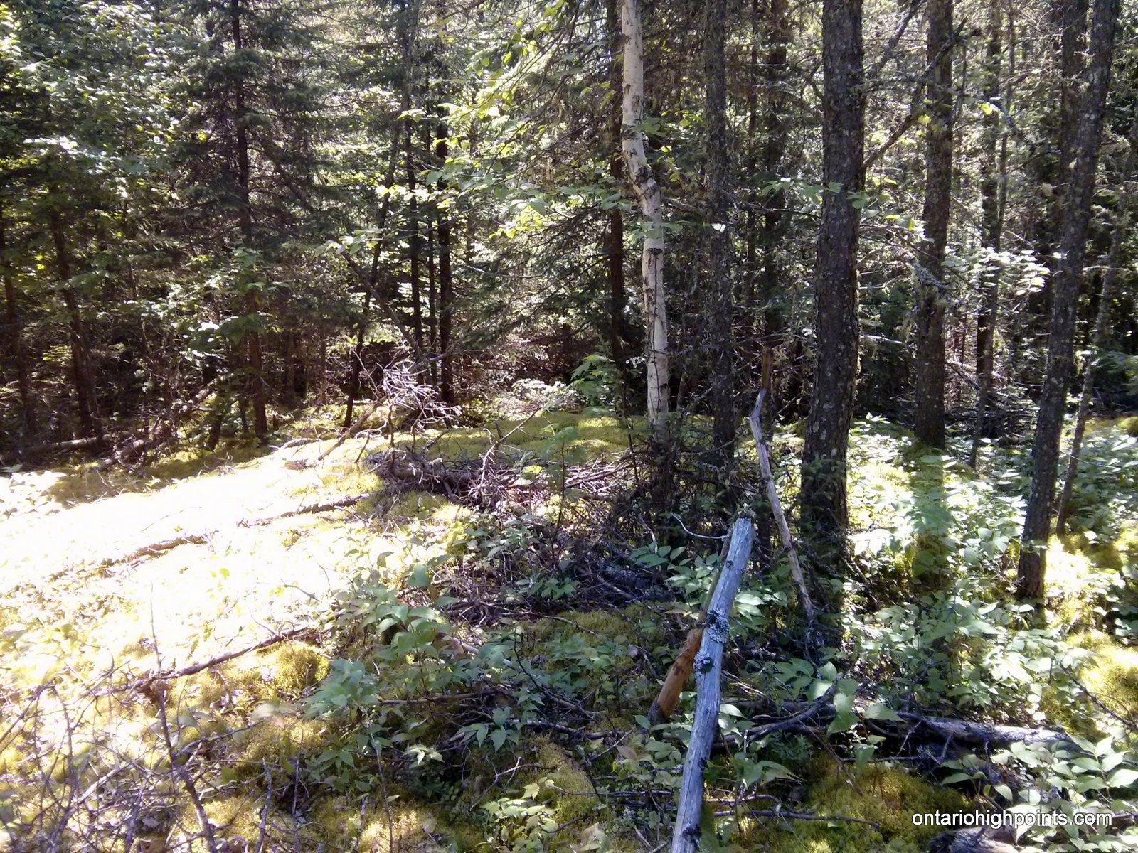 13 km from the parking area, you will cross a small creek near Swiss Lake and shortly beyond that begin the bushwhack northwest to the Kenora District High Point area. It’s about a 900 meter direct beeline to the first candidate high point, however the bushwhacking will be slow and difficult, as you will need to navigate through/around mixed woods with exceptionally dense undergrowth, large boggy/wet areas with tall grass/brush, and fair amount of blowdown. The first candidate high point is atop a small mossy rock outcrop ridge, and is now marked with a canister. (Placed by Ben Lostrocco).