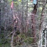 After crossing a small stream, we headed into the woods and began our bushwhack. Initially, we made an westward arch to avoid a boggy area, and then after avoiding the bog, we turned northwest to intersect the summit area. It was a tough bushwhack with lots of thick jackpine stands. We found the first candidate high point summit atop a mossy rock ridge, about 30 meters away from the spot height marked on my maps/gps. Ben placed a CoHP register cache with log book before we left.