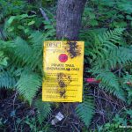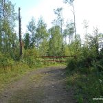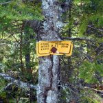 We suited up and started our hike west along the railway bed and immediately had to dodge around fallen trees and thickets of tag alders. My opinion is that the trail will not be passable in a few years if no maintenance is performed. After a short distance, we arrived at a 4-way intersection. To the south we could see a camp complex with numerous buildings. We ignored the south and north routes and continued west through the intersection. Just past the intersection, we spotted a boundary sign for the LaVerendrye Provincial Park hanging on a tree. We passed by the sign and entered the park.