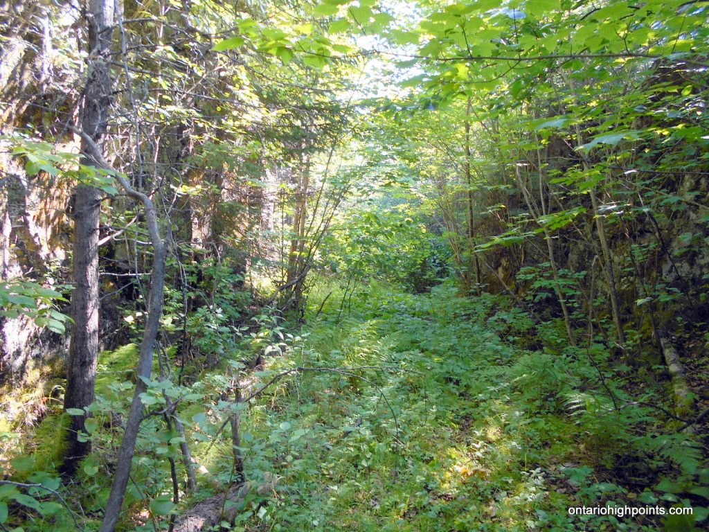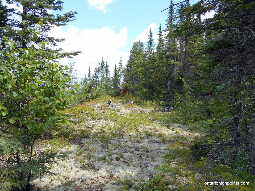 Follow the railway bed to Little North Lake and begin the bushwhack to Little North Lake Peak near the following coordinates: N48 07.578 W90 34.765. Follow a compass bearing of 343 degrees – parallel a creek valley for 1.6 km to the summit. The summit is at the top of a open ridge running northeast-southwest. There are good views northwest to Peak 639.
