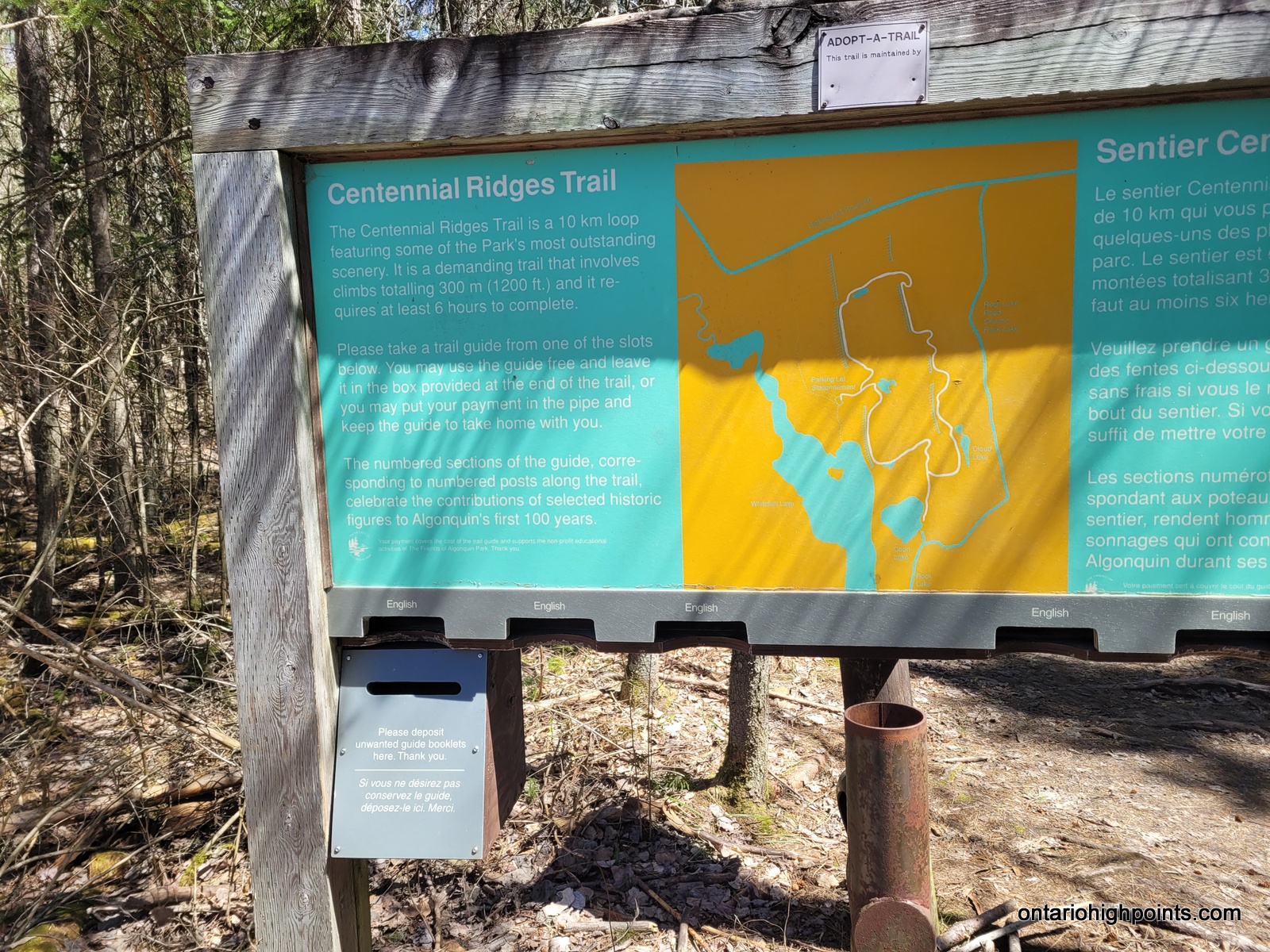 To get to the Centennial Ridges Trailhead in Algonquin Provincial Park, follow Highway 60 to Centennial Ridges Road, located just east of the Pog Lake Campground. The trailhead is at the end of Centennial Ridges Road, approximately 2.1 km from the highway, and includes a designated parking area for hikers. After parking, simply follow the clearly marked trail signs to begin your adventure on the scenic Centennial Ridges Trail.