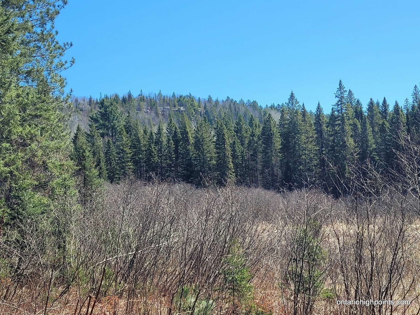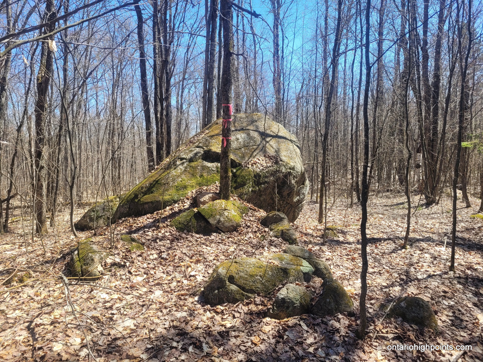 The trail begins by heading east for 0.6 km to a Loop Junction, where hikers should stay left (clockwise) and continue climbing 0.8 km northerly to the top of the Centennial Ridge cliffs, offering continuous great western views for 200 meters. At a large erratic (N45.56210 W78.41715), depart the trail and bushwhack east for 60 meters to reach Centennial Ridge Mountain (N45.56236 W78.41668). The summit is marked by another large erratic; this area features easy open deciduous woods and several erratics, though no views are available.