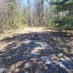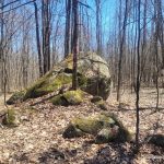 From here (N45.56875 W78.40829), a bushwhack to the rock face leads to a scramble up the fault to the top, followed by an easy walk along a fairly flat ridge to the summit of MacDougall Mountain (N45.56789 W78.40721). This summit features a moss-covered rock outcrop in a small clearing amid open deciduous woods, offering partial views to the west. A rock cairn marks the summit.