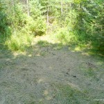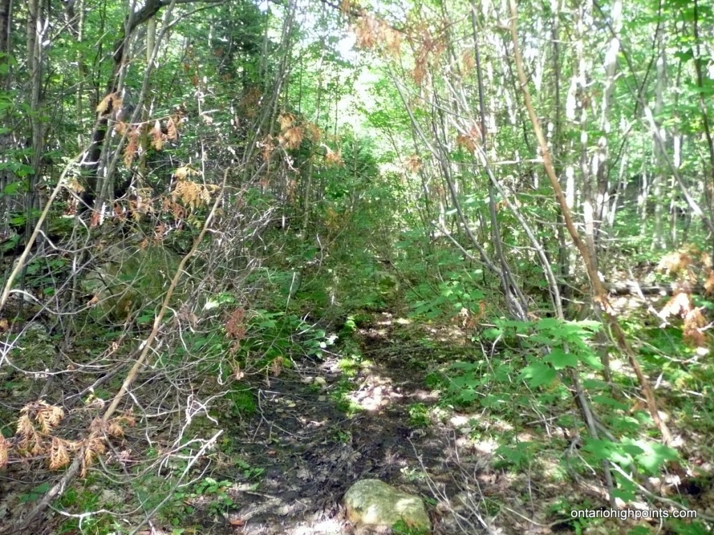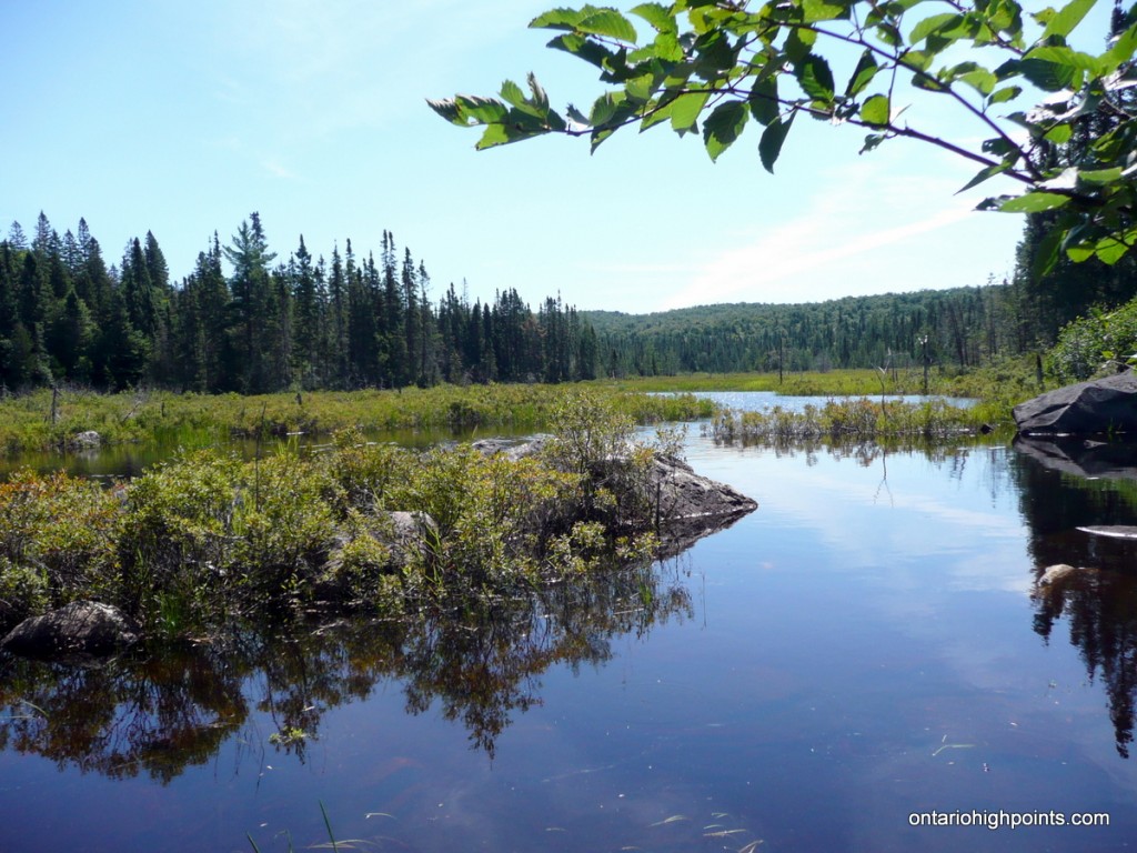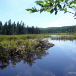 Continue on foot or on bike along the ATV path for 1.5 km to where a beaver dam has flooded the entire area including the road. It is possible to avoid most of the flood zone by crossing along the top of the beaver dam. Beyond the beaver dam, continue north for 0.6 km to a hidden right turn onto an overgrown path. 1.8 km from the right turn, the ATV path ends at a creek and beaver pond. Cross the stream along the top of this much shorter beaver dam to a trail that is almost completely overgrown. If riding bikes, this is a good place to stash them.