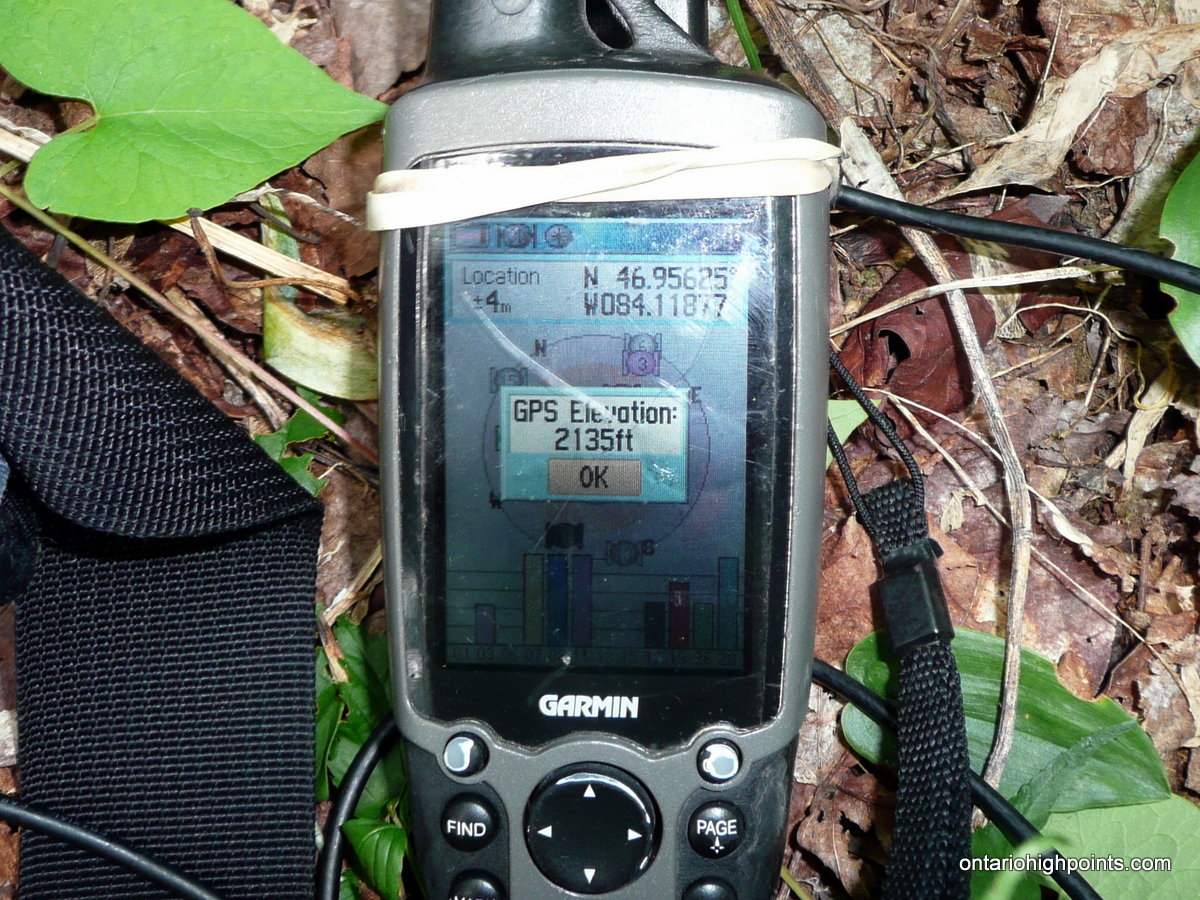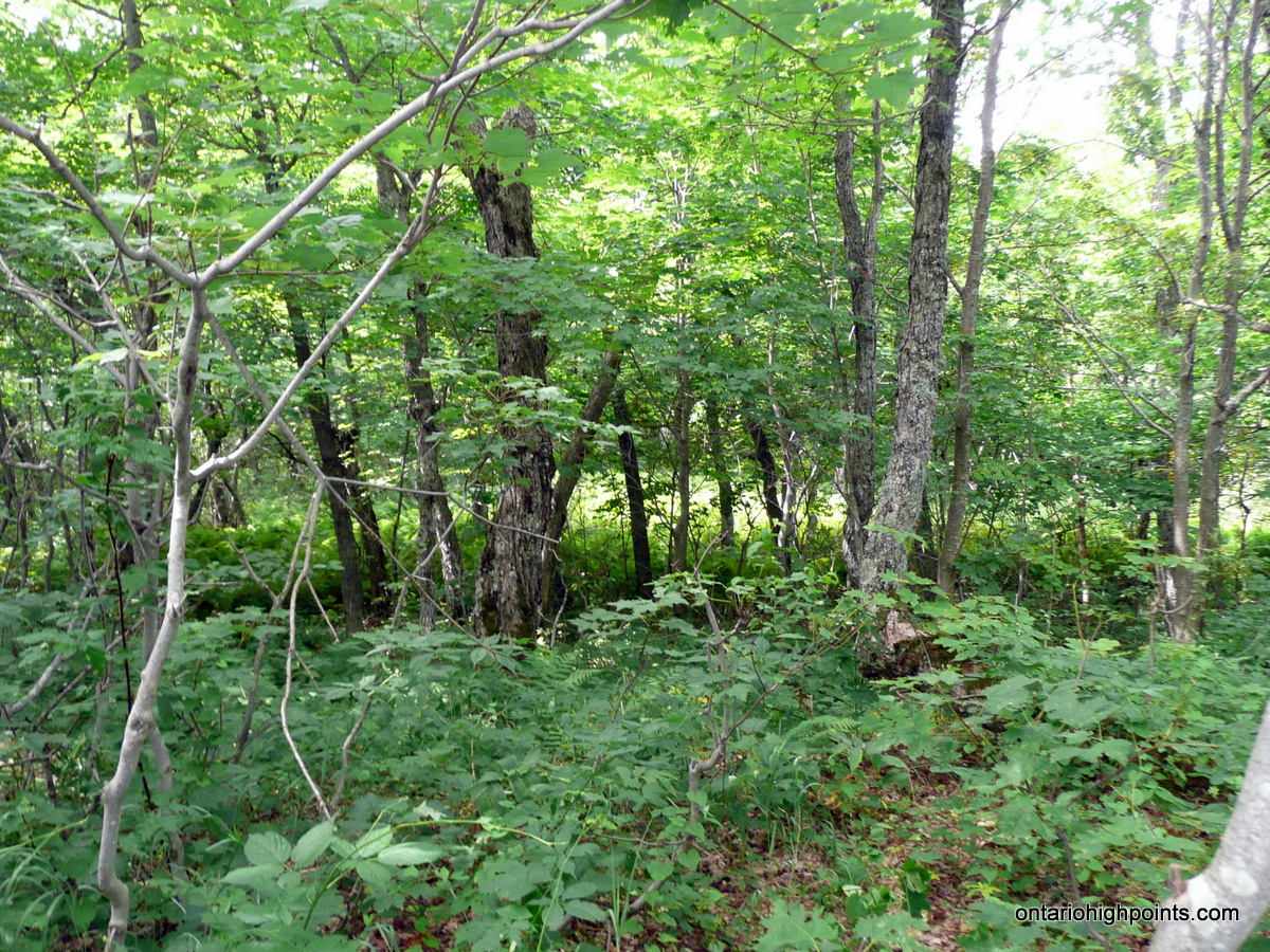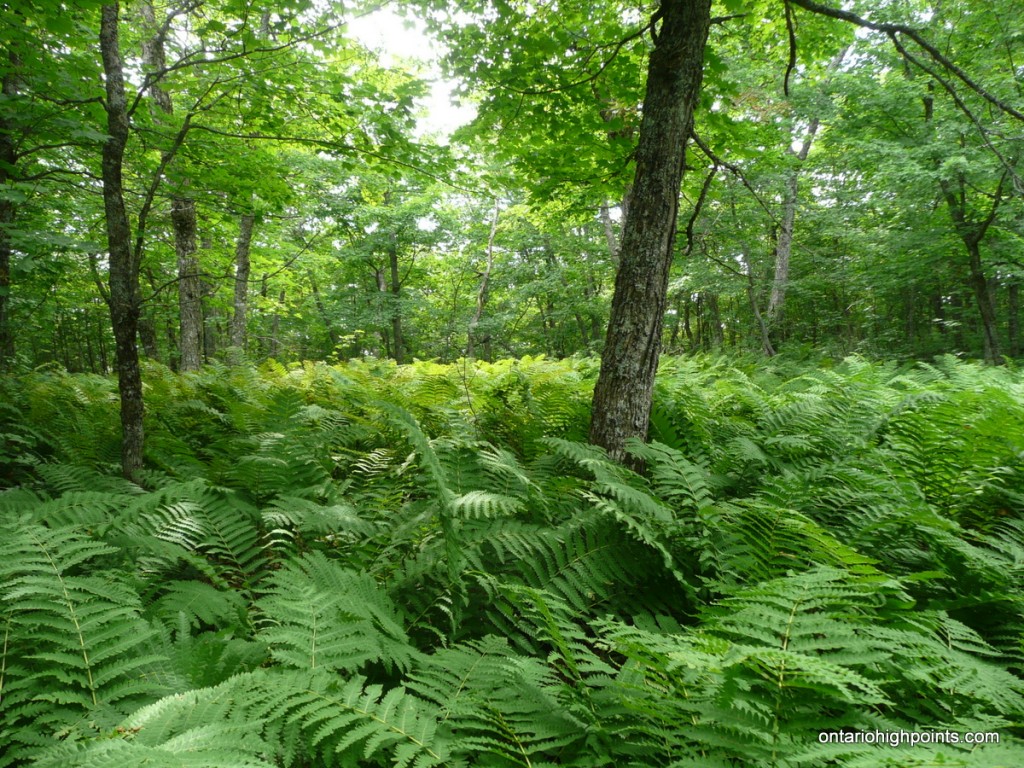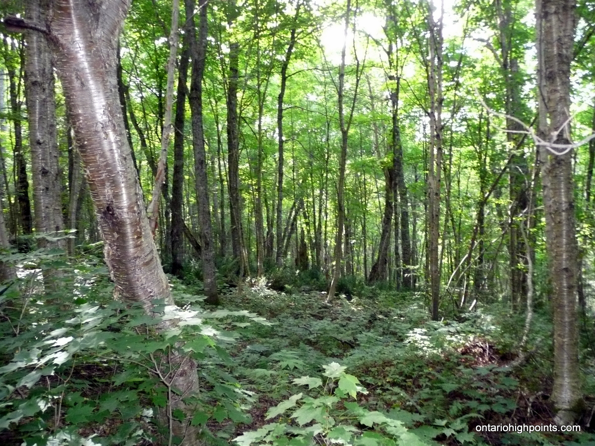 Heading east, we stumbled through a fern glen (a seemingly common feature of Algoma’s Peaks) to the summit. As the summit region was fairly broad and wooded, it was fairly difficult to know which rise was the actual highest. 2 spots, one just north and one just south of the Ontario Base Map spot height appeared to be potential high points — However Dan and I agreed that a point just 70 meters to the south appeared to the the highest.