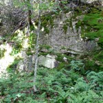The overgrown trail runs northeast, parallel to a small creek. After about 1.5 km from the beaver dam, the trail disappears entirely and the rest of the route to Marne Peak must be bushwhacked. It is recommended to continue bushwhacking northeast for 1.0 km until arriving at a large sloping rock outcrop. This is the site of an old logging chute which was used to flush logs down off the mountain.