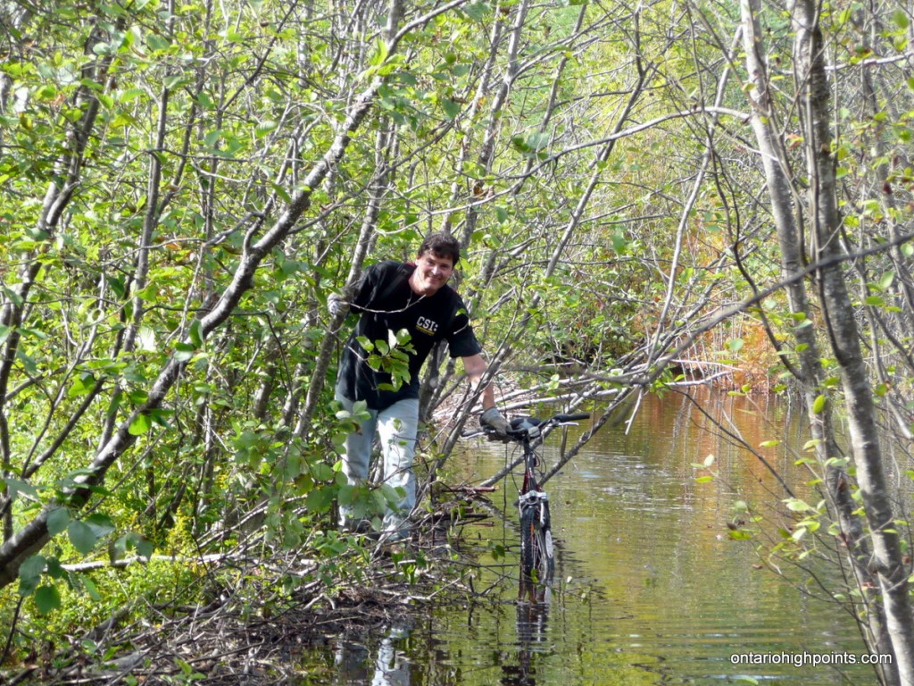 13.5 km – Reclaimed bikes stashed at the beaver dam crossing – start of ATV road (5:00 PM)