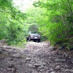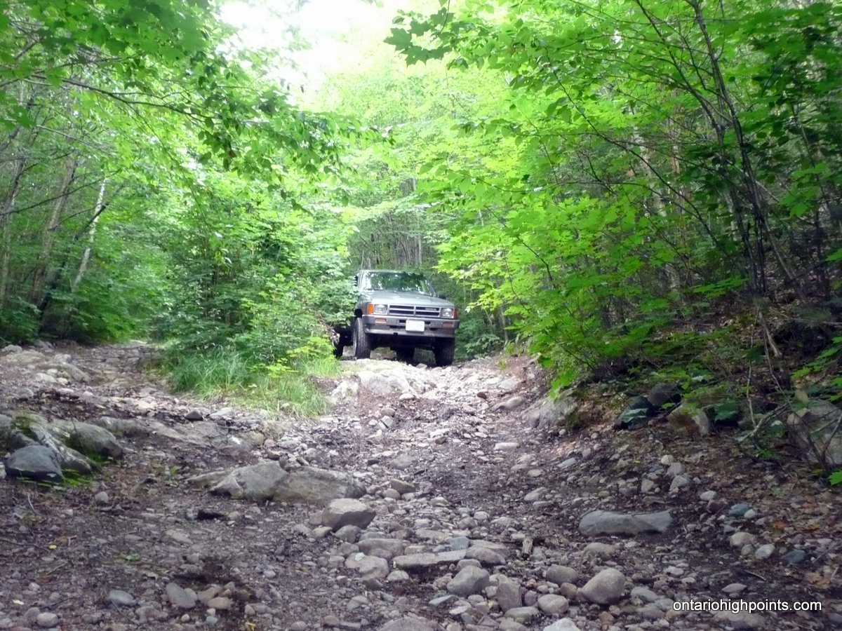 Back at the truck we packed up our bikes, changed our clothes and headed back along the Achigan Lake road. I got out at the really rough spot to film Dan driving down the hill. As I was filming it, a thought occurred to me that where I was sitting was perhaps not the safest spot if Dan happened to lose control. I stumbled back off the road into some trees in an attempt to give myself some space, adding a ‘nice’ shaking motion to the video I was taking.