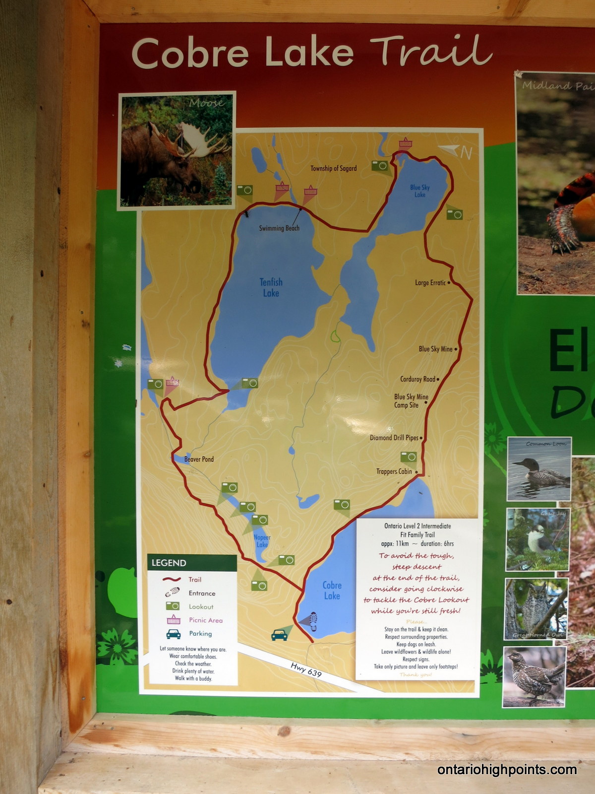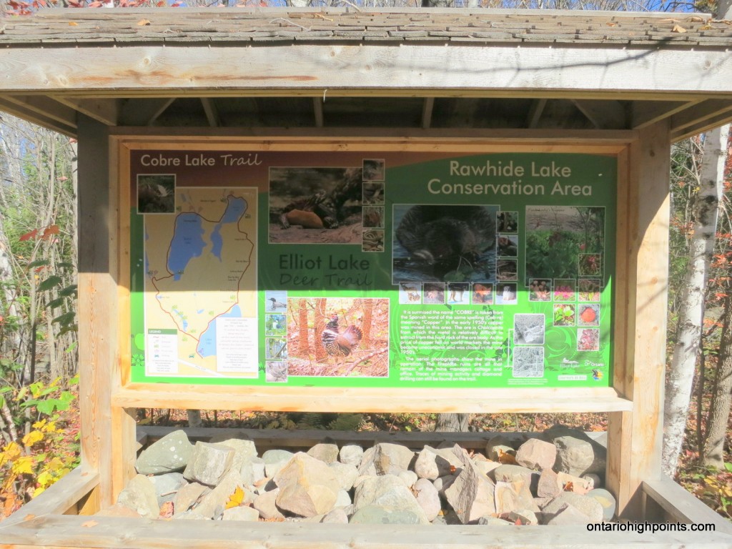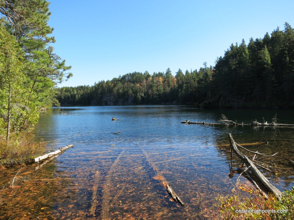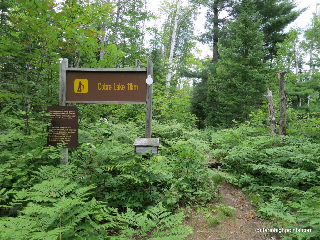 From the intersection with Hwy. 17 at Serpent River, take Hwy. 108 north to Elliot Lake for 27 km. Continue north along Hwy. 108 through Elliot Lake. At Quirke Mine Road, 42 km from Hwy 17, Hwy. 108 becomes Secondary Highway 639. Continue northward along the road for 20 km and pass through Mississagi Provincial Park. The turnoff to the Cobre Lake Trail parking lot lies 62 km from the junction with Hwy 17, just as the road starts to descend into the Little White River valley. Turn right onto the short rough road and make your way east for 250 meters and then turn left at the 3 way intersection and head north for a further 250 meters to the parking area.