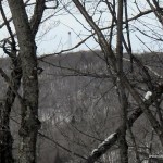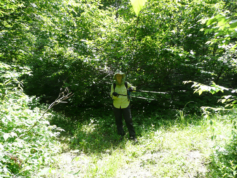We hiked up the main bulldozed road for 6 km, avoiding the smaller side trails at the 1 and 5 km marks and came into a larger cleared area. Although it looked like the logging road narrowed and continued to the northwest, this seemed to be the terminus of the main road we came in on. This was also the spot where my maps indicated a road to the south would take us to Ogidaki Mt. We found the trailhead to an narrow overgrown track on our left, and after a brief break, we were on our way.