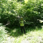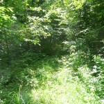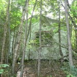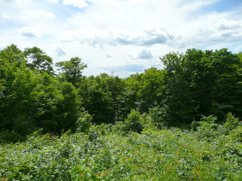 1 km beyond the fork, we came upon the Ogidaki fire towerman shack, very much in a state of disrepair. The windows had been smashed and walls and flooring had seen some trauma, but it appeared to have be recently used as I noticed a bottle of Sunlight detergent beside the kitchen sink. Beyond the shack the trail climbed moderately and we found ATV tracks as well as some spent shotgun shells. Finally 1.1 km past the shack, the trail ended at the cleared summit of Ogidaki mountain. A well preserved fire tower and a Ministry of Natural Resources shack stood at the edge of the clearing; it’s bottom ladder missing, as to prevent people from climbing to the lookout. Val and I spent some time resting in the sun and unlike our previous day’s outing to Griffin Lake Peak, without large amounts of mosquitoes and blackflies. Despite the clearing at the summit, tall trees obscured any possible view.