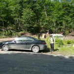 We thought we were in some pretty remote country, when we noticed 2 old ladies drive past us in a Corolla. Further back I had seen signs (for snowmobilers presumably, as this road is used as a snowmobile trail in the winter), that indicated the road went all the way to Wawa. I couldn’t be sure if they were coming from Wawa, but I’m certain this road would not by my preferred route. I also noticed that the sideroad we were to travel up was not only unsuitable for a city car, but it was currently undergoing active logging operations. This meant that we would be parking the car here and beginning the hike on foot.