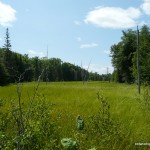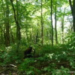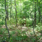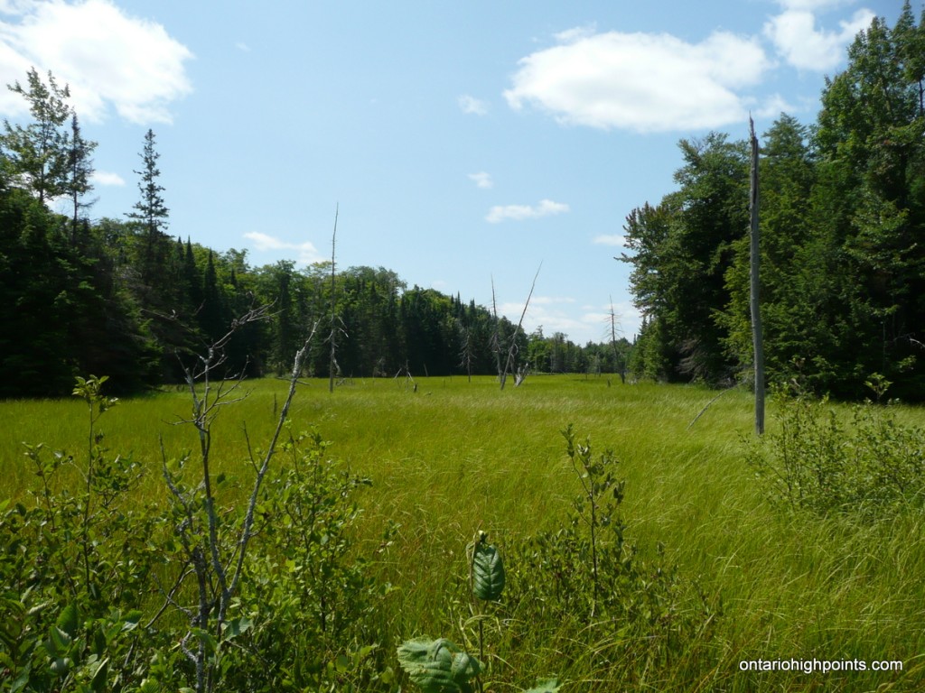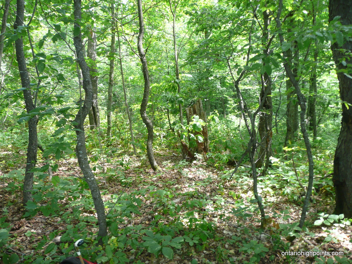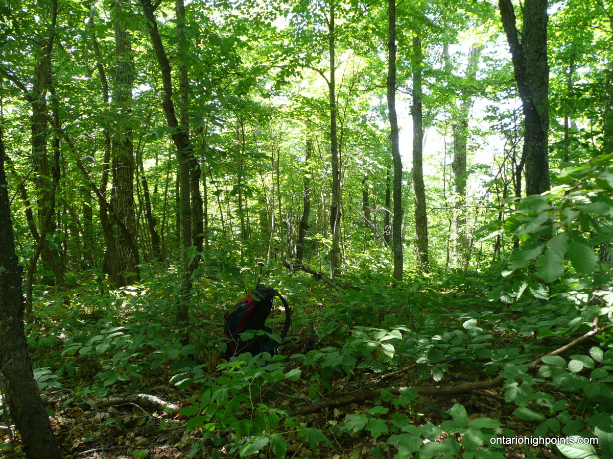 Hike up the road for 1.4 km until reaching a gate. Beyond the gate is the “Organized Hunt Camp Area” property. 600 meters beyond the gate up the road is the best spot to begin the short 400 meter bushwhack to the deciduous treed summit of the Parry Sound District High Point. The highest point appears to be on a slight ridge just south from the OBM spot height.