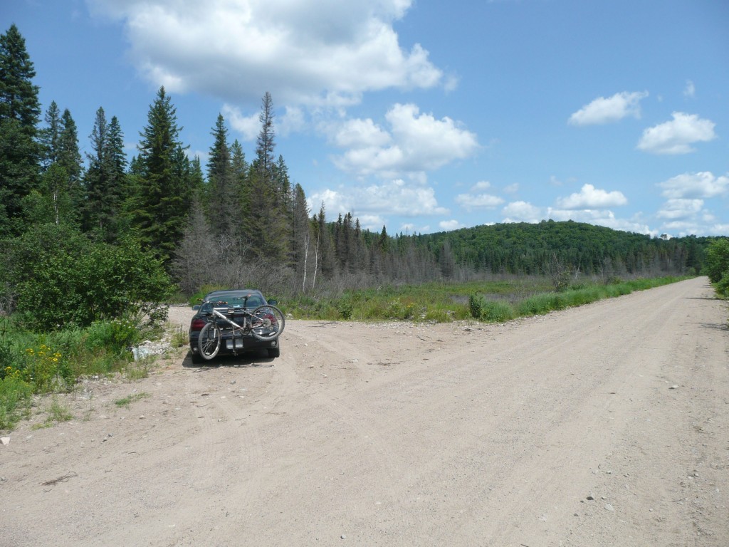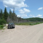 Take Highway 11 north from Huntsville for 20 km and take exit 244 onto Fern Glen Rd towards Emsdale. After 2.7 km, turn right onto 518 and travel 8.2 km to Kearney. In Kearney, turn right onto Rain Lake Road. Follow Rain Lake Road east, which soon becomes a dirt road for 24 km. The road passes by some recently blasted rock piles and makes a 90 degree turn shortly (1.3 km) before coming to a smaller gravel road which is used by ATVs.